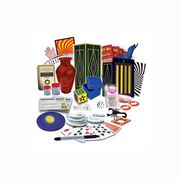 El Kit de Magia Deluxe es la caja de lujo por excelencia de nuestra línea de juguetes. Con este Kit de Magia Deluxe podrás armar tu propio show con increíbles aparatos de magia. Aparece caramelos de la nada, adivina el número que una persona está pensando, haz flotar cartas, monedas, billetes y tarjetas de crédito de la manera más increíble! Transforma papeles blancos en billetes, traspasa monedas a través de envases plásticos, produce agua de la fuente inagotable del jarrón mágico de dragón, aparece en tus manos a un enano o un escorpión negro! Vuélvete un experto en la magia con cartas con tu baraja especial que te permitirá hacer cientos de trucos y mucho, muchísimo más!