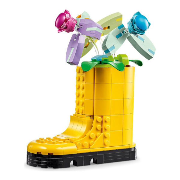 Las niñas y los niños de 8 años o más pueden convertir este juguete conectado con el mundo natural en una bota de agua amarilla que tiene dentro 3 flores con pétalos móviles o en 2 simpáticos pájaros amarillos de juguete posados en una percha cubierta de flores y, después, exponer cada modelo con orgullo en su habitación.