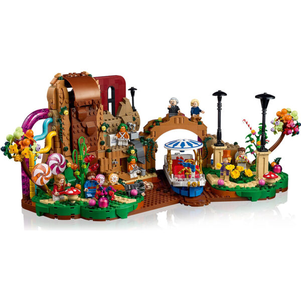 - Fieles detalles construidos con ladrillos LEGO®: La cascada de chocolate con tubos de vivos colores, el barco Wonkatania, la zona de trabajo de los Oompa Loompas, la oficina de Willy Wonka (con una puerta secreta), plantas de caramelo y más